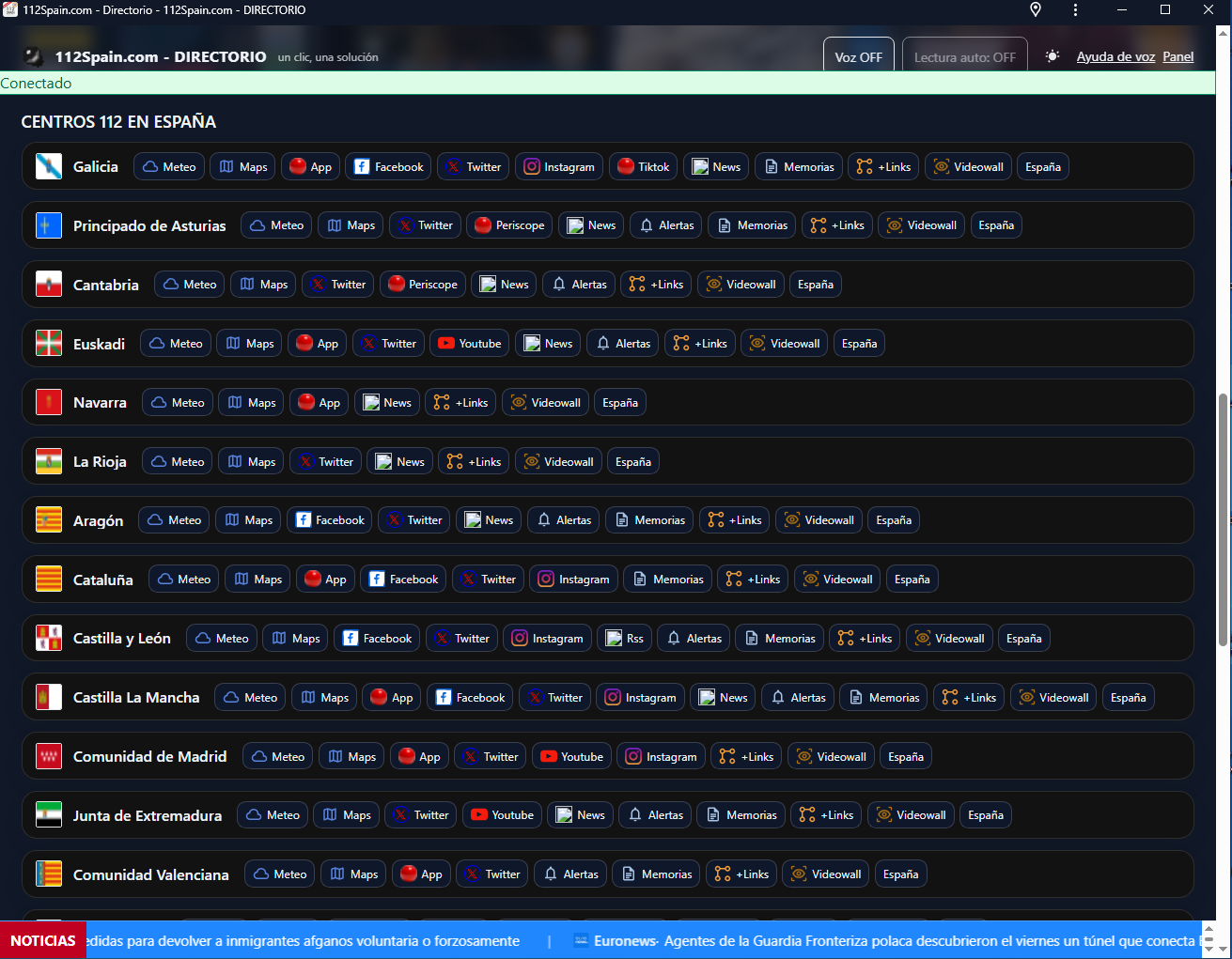 Esta aplicación gratuita facilita su acceso a las webs de los Centros 112 de España, resto de Europa y algunos países de Euroasia, mediante una pantalla intuitiva e interactiva que localiza el centro 112 más cercano dependiendo de su posición GPS (siempre y cuando haya autorizado el compartir geolocalización) pudiendo acceder, buscar por voz, grupo, país o visualmente mediante mapa el centro de tu interés, así como sus redes sociales, enlaces y videowalls relacionados y más información de interés.